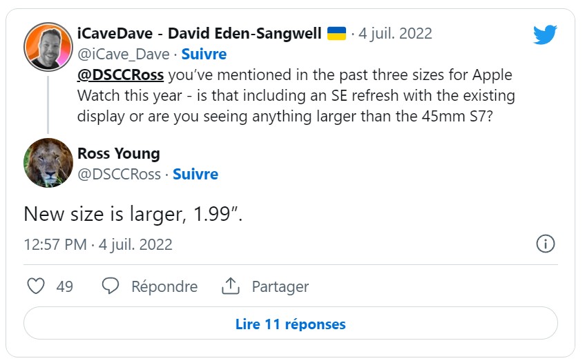 En juillet, Ross Young a ajouté une autre taille à sa prédiction, indiquant que cette taille pourrait être de 50 mm. Ainsi, le cadran de la montre sera 5 mm plus grand que la plus grande Apple Watch 7. Elle mesurera presque 5 cm.