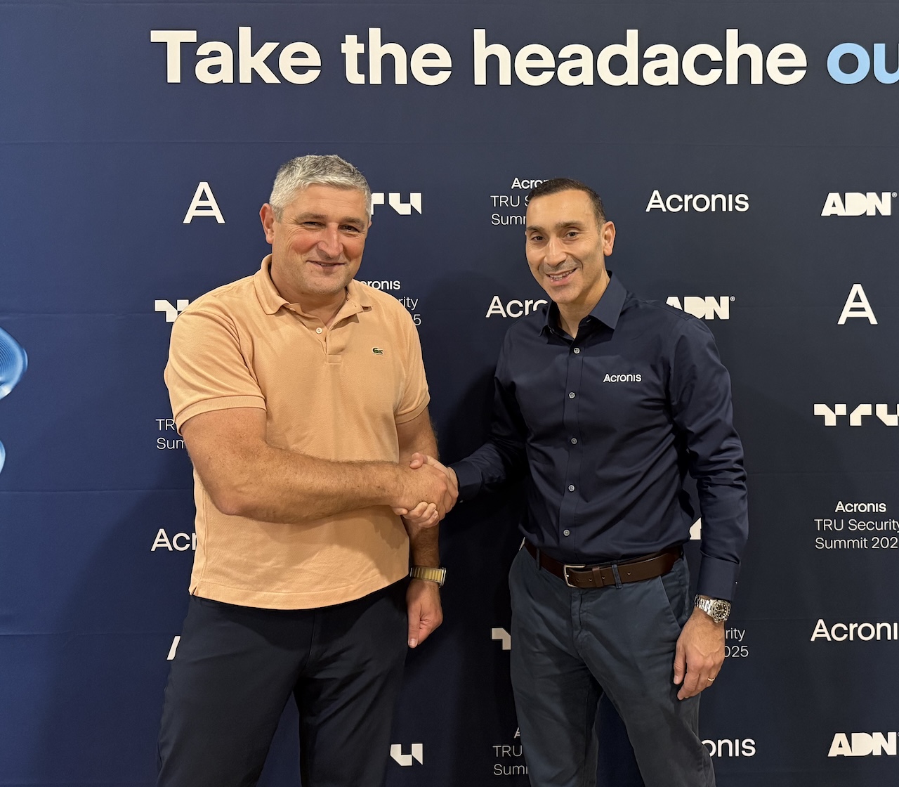 Oleg Bivol, PDG et co-fondateur de Watsoft (à gauche sur la photo), a conclu un accord de distribution avec Samy Reguieg, DG France et Afrique chez Acronis lors de l’évènement TRU Security Summit 2025 qui s’est tenu à PortAventura, près de Barcelone. (Crédit Acronis)