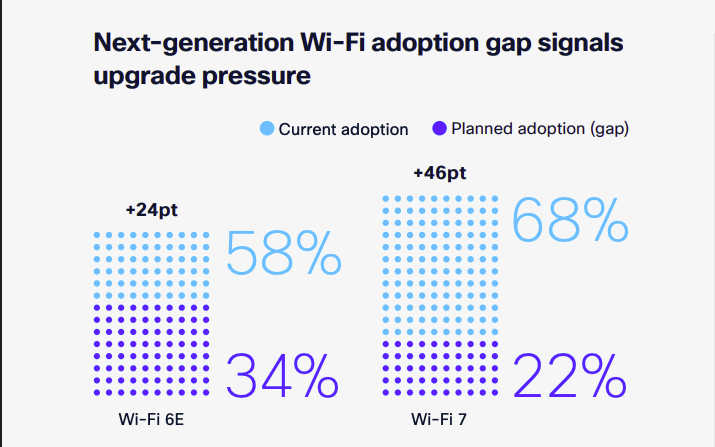 L'une des avancées sans fil utilisées pour faire face aux défis de capacité liés à l'IA est l'ajout de la bande 6 GHz introduite par le WiFi 6E, « et dont l'utilisation a encore progressé avec le WiFi 7 », précise Cisco. « Les entreprises y recourent pour résoudre des problèmes de capacité et de congestion (46%), activer des applications à haute bande passante (32%), et prendre en charge des charges de travail IA (31%). Et les recherches montrent que ceux qui adoptent ce spectre supplémentaire en tirent des bénéfices significatifs. »