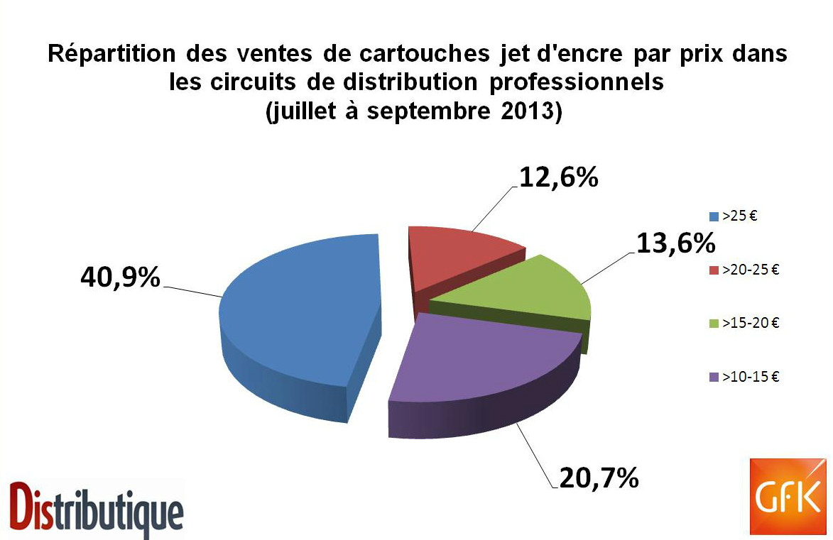 En 2013, les ventes de cartouches jet d'encre devraient dépasser les 72,6 millions d'unités en France, dont 29% seront commercialisées dans les circuits de distribution professionnels. 91 % du chiffre d'affaires du marché BtoB sont réalisés par les équipementiers et les fournituristes de bureau. Dans les réseaux de distribution professionnels, le prix moyen des cartouches se redresse cette année avec une montée en puissance des ventes de multi-packs.