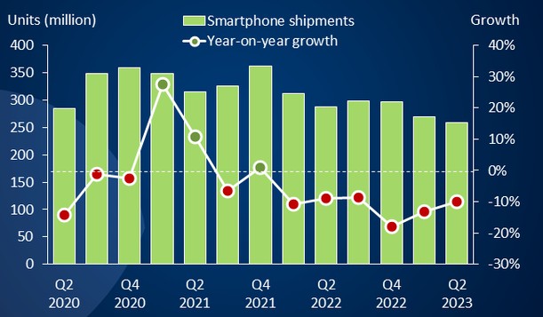 Evolution des ventes mondiales de smartphones entre les deuxièmes trimestres 2020 et 2023. (Crédit photo : D.R.)