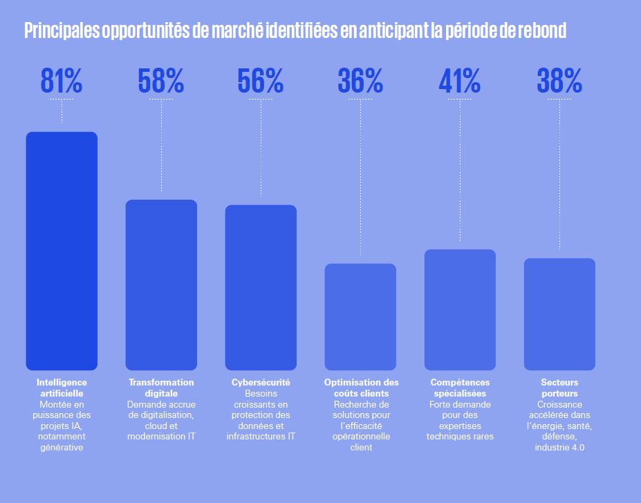 Enfin, d'un point de vue business, les entreprises interrogées restent prudentes puisque 42% n'anticipent un véritable rebond de l'activité qu'au premier semestre 2026. Les principaux risques identifiés sont pour 85 % d'entre elles la conjoncture globale suivie par la faiblesse de la demande client (67%) et le manque de ressources ou de compétences (33%). Pour surmonter ces défis, les SSII et ICT s'orientent donc vers le développement de partenariats stratégiques (60%), l'investissement dans la marque employeur et le recrutement de profils clés (55%).