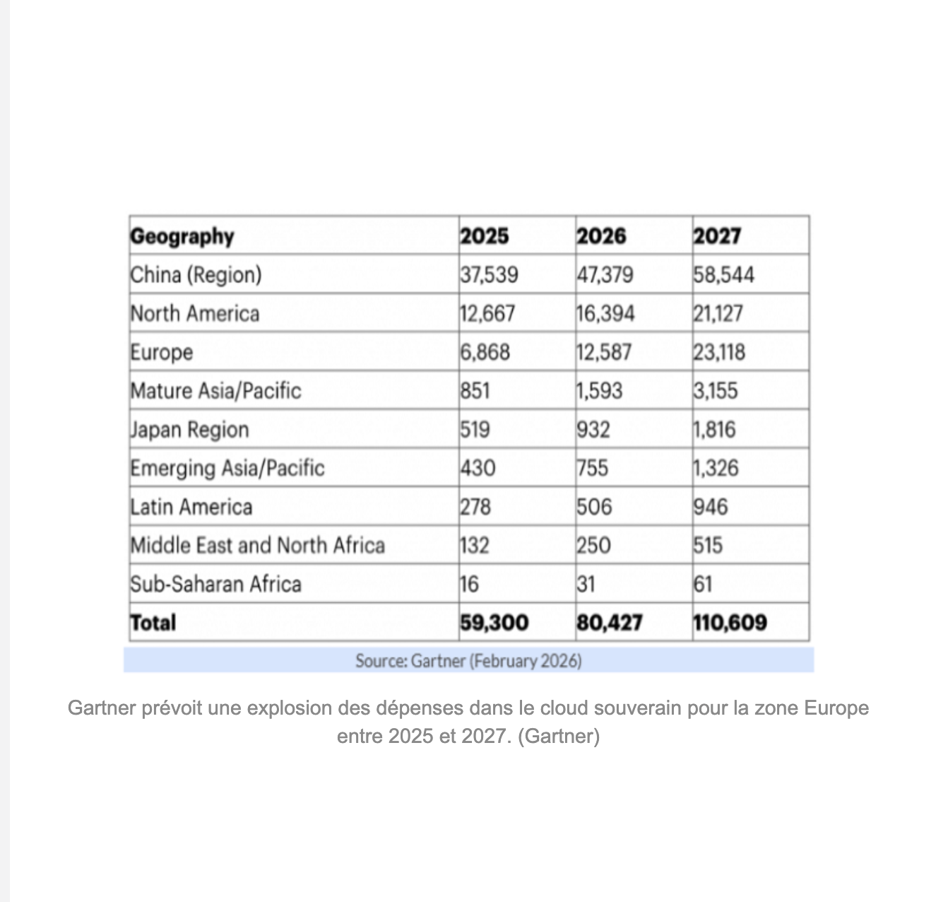 Après la multiplication des annonces autour des clouds dits souverains, Gartner donne une version chiffrée de l'appétence des organisations européennes pour ce type d'offres. Le cabinet d'analyse estime que la zone Europe va voir ses investissements dans ce domaine plus que tripler entre 2025 et 2027 en passant de 6,86 Md$ à 23,11 Md$. Au niveau mondial, les dépenses vont passer de 59,3 Md$ en 2025 à 110,6 Md$ en 2027.