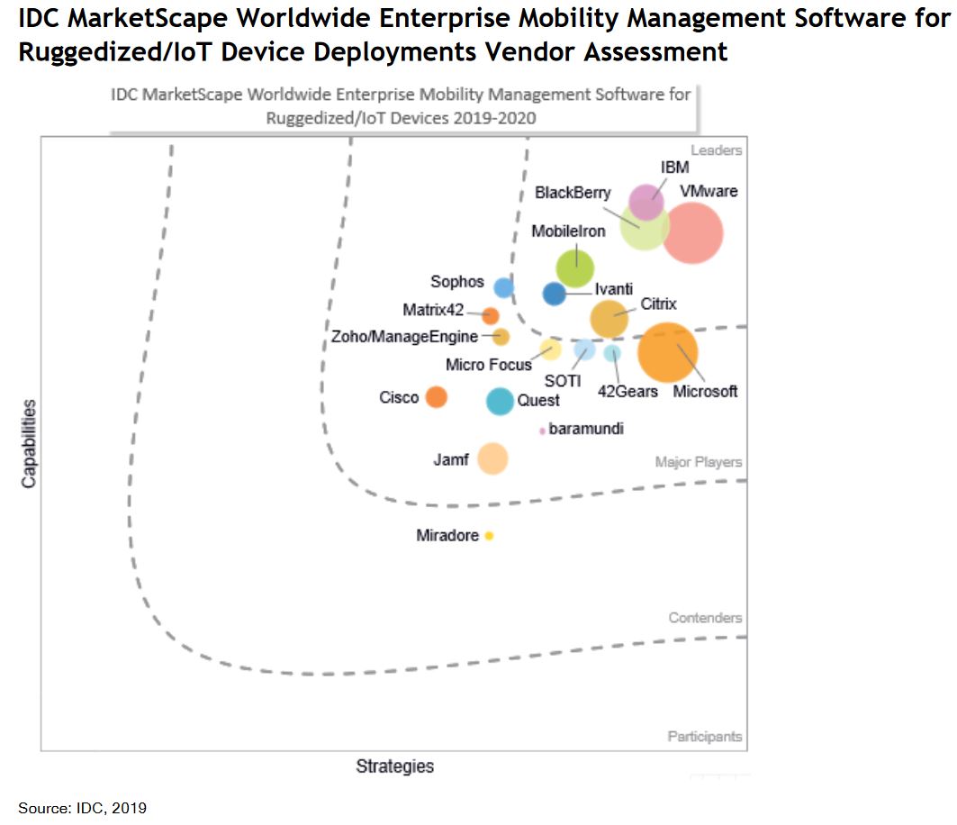 Dans son étude de marché, IDC place également MobileIron, Ivanti et Citrix comme autres leaders, derrière les trois déjà mentionnés cependant. Deux critères ont été pris en compte par le cabinet d'étude. D'une part, que les fournisseurs proposent bien une suite EMM, c'est-à-dire une plateforme proposant à la fois des capacités de gestion d'appareils mobiles (MDM), de gestion d'applications mobiles (MAM) et de gestion de contenu mobile (MCM) pour au moins un système d'exploitation mobile (iOS ou Android), ainsi qu'une prise en charge intégrée et unique pour au moins un des systèmes d'exploitation PC suivants : Windows (7/10), macOS, ChromeOS ou Linux. De plus, les revenus générés par ses plateformes doivent dépasser les cinq millions de dollars pour l'année civile 2018.