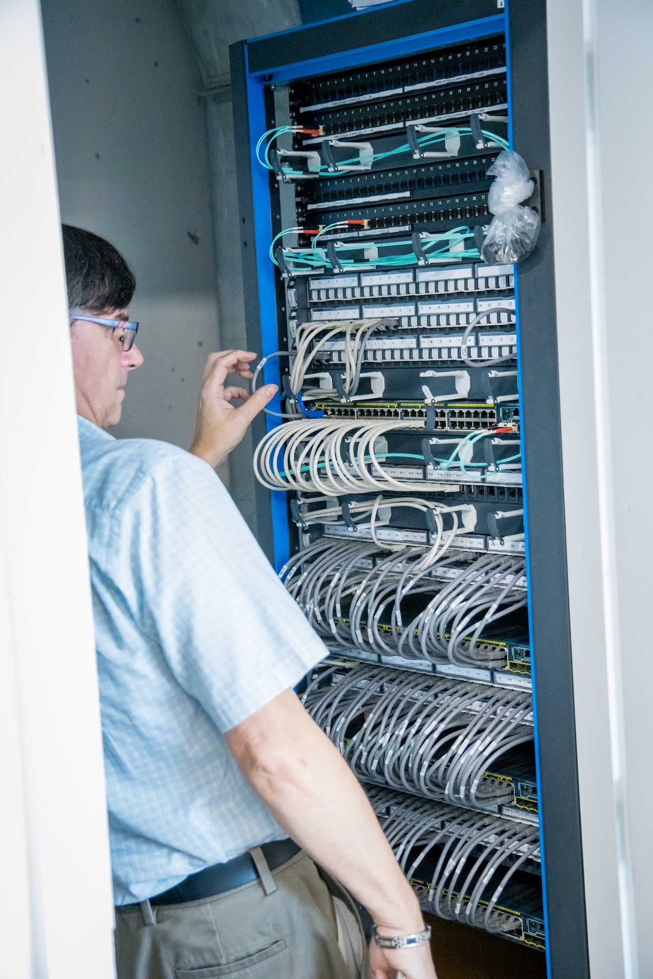 Un collaborateur de l’entreprise œuvrant sur une baie de brassage qui centralise le réseau et la téléphonie. (Crédit Paritel)